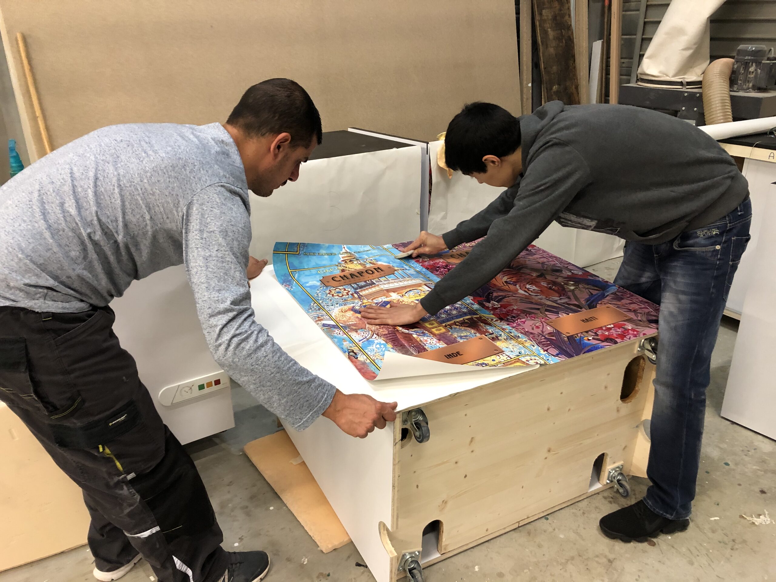 Impression des fichiers dans notre atelier, avec façonnage des supports si nécessaire.
